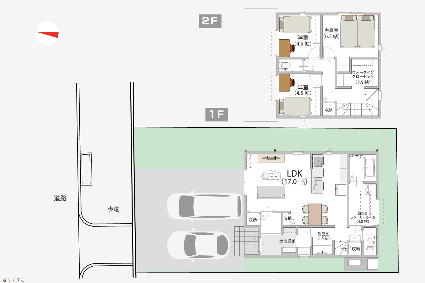 | その他面積 | ランドリールーム3帖、洗面室1.5帖、ウォークインクローゼット2.5帖、土間収納1帖 | 駐車場 | - |