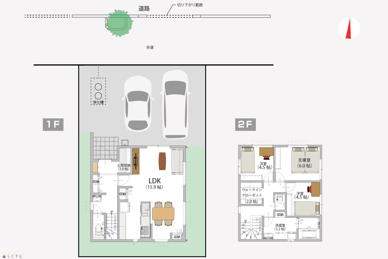 | 15.9帖のLDK! 朝と夜の支度がスムーズにできる動線です! 1階と2階に洗面台がある間取りです。 即引き渡しが可能です♪ | |||