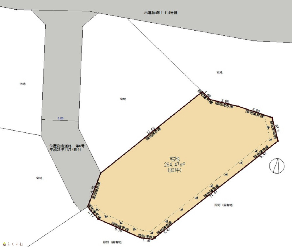| 形状 | 間口 4.87m × 奥行 17.6m | 道路 | 位置指定道路第6号H28.11.4付 |