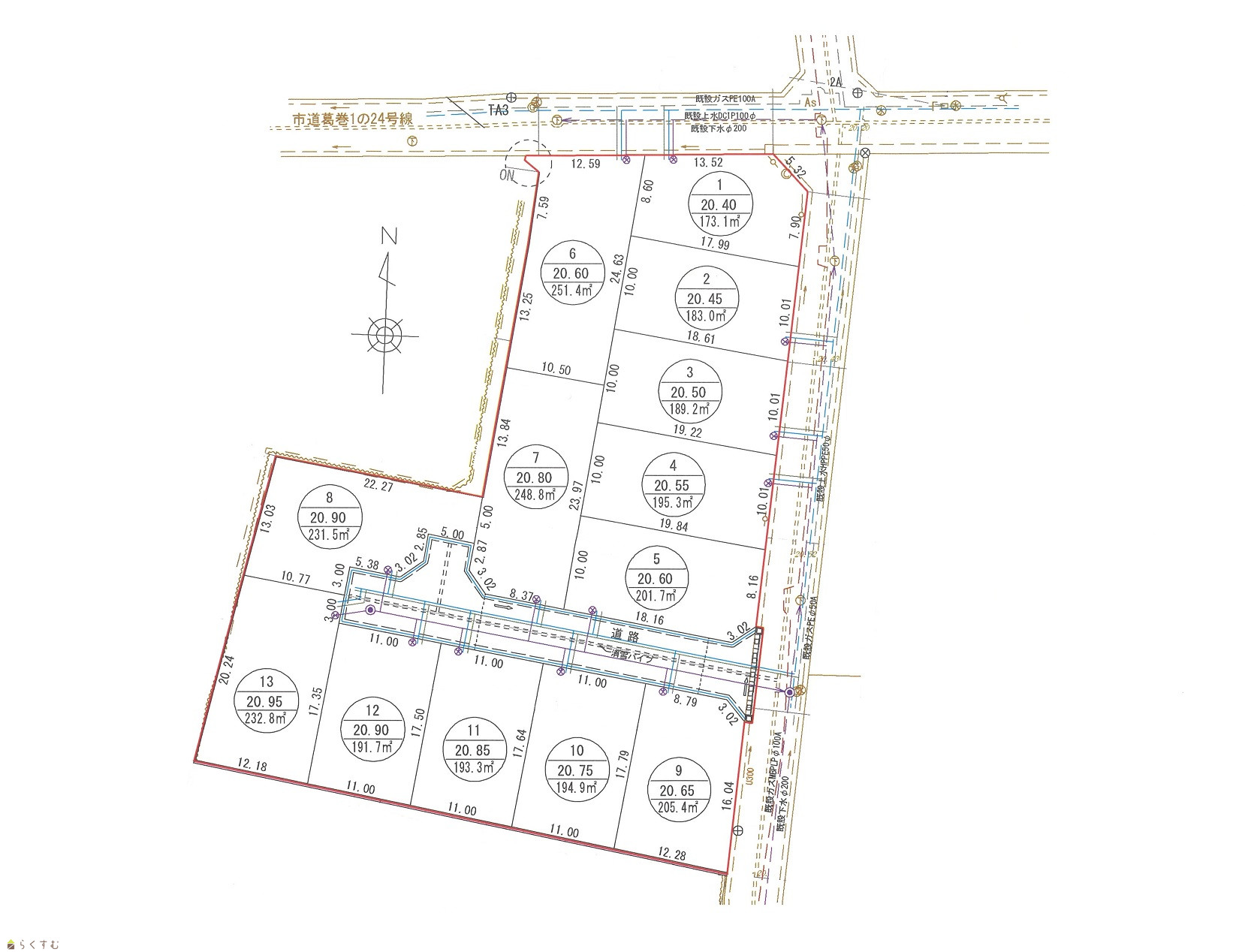 | 設備 | 整形地、前道6m以上、スーパー近く、閑静な住宅街、建築条件なし、側溝、都市ガス(宅地内)、上水道(宅地内)、下水道(宅地内)、前面道路融雪設備あり、住宅向け | ||