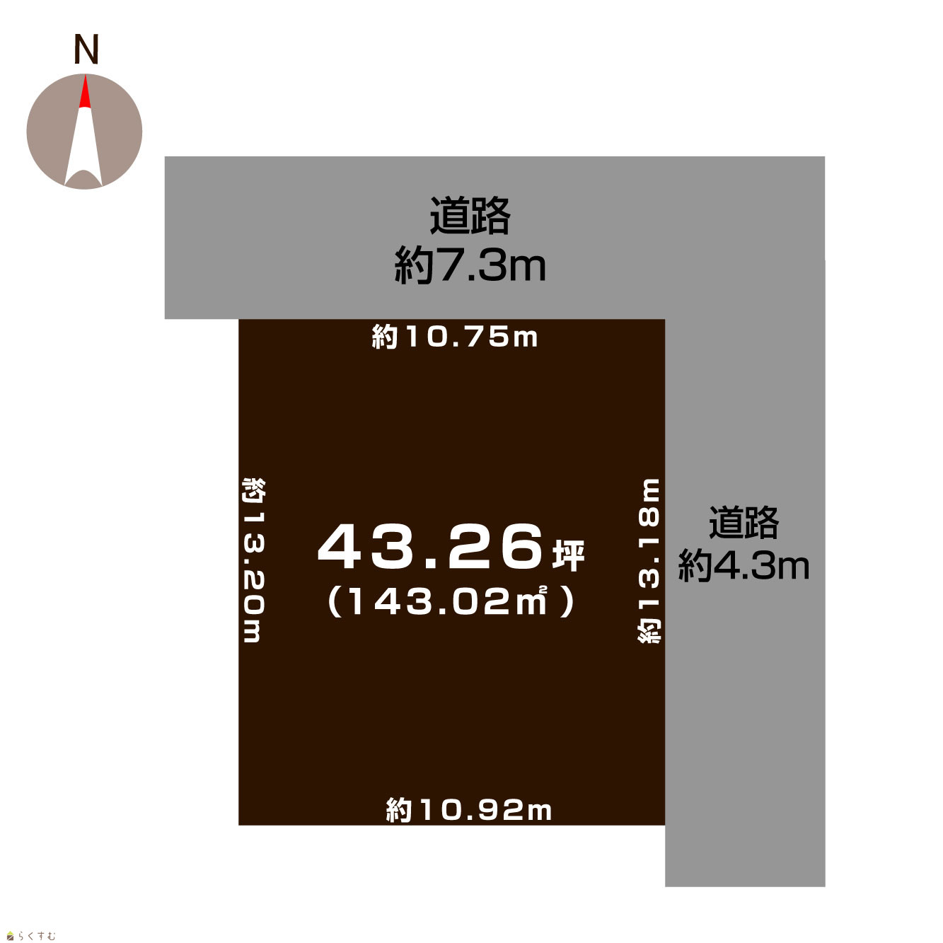 | 形状 | 間口 10.75m × 奥行 13.18m | 道路 | 公道 北 幅員7.3m/公道 東 幅員4.3m |