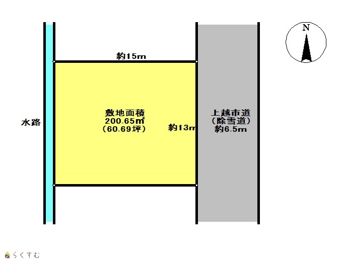 | 形状 | 間口 13m × 奥行 15m | 道路 | 東側、上越市道6.5m、除雪道 |