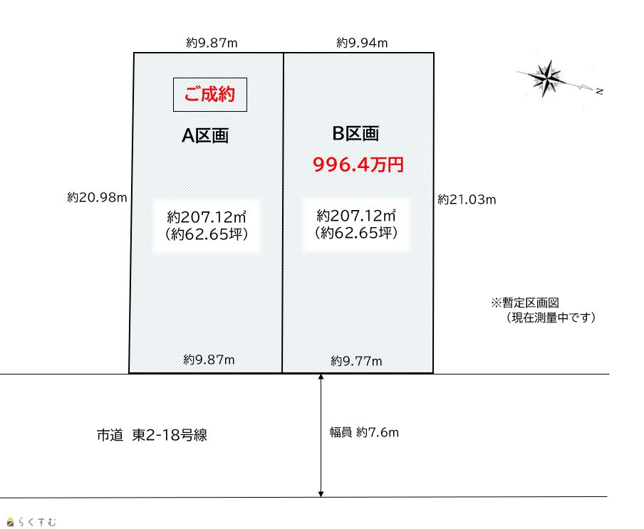 | 備考 | ※測量依頼済みです。区画図、間口・奥行きは概算で記載しています。 区割りの変更は可能ですのでご相談ください。 |