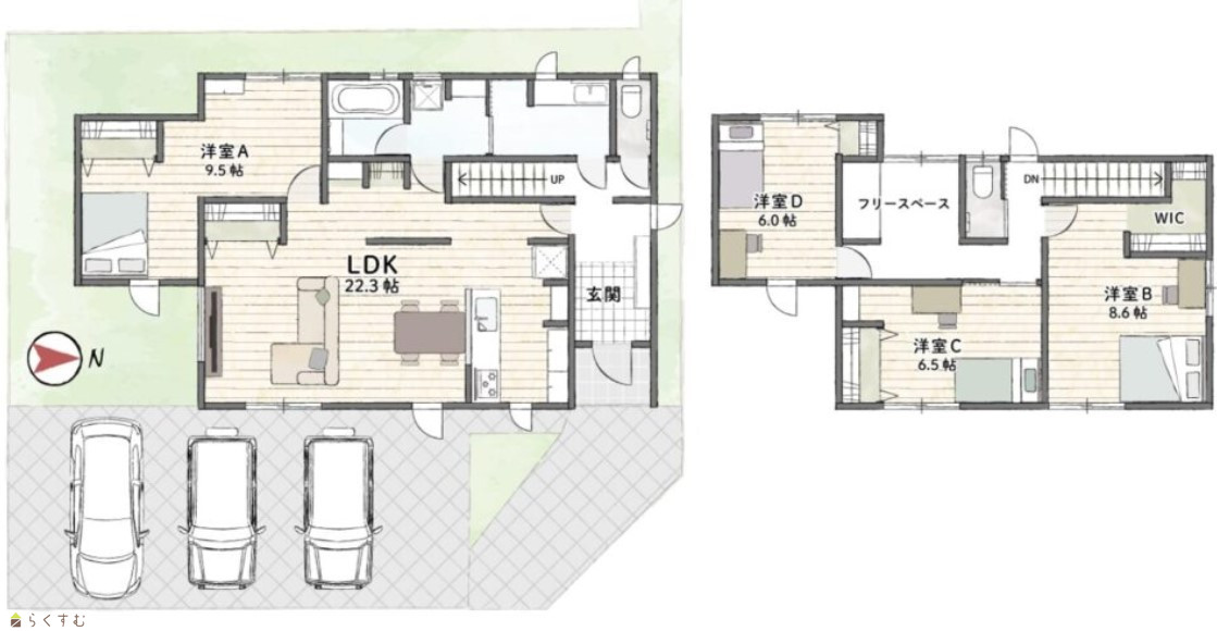 4LDK (洋室:9.5、8.6、6.5、6.0) LDK22.3 |