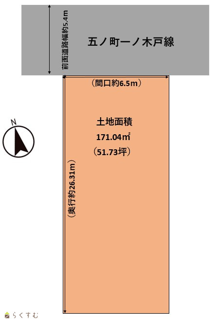 | 形状 | 間口 6.5m × 奥行 26.3m | 道路 | 公道(約4.0m)融雪道路 |