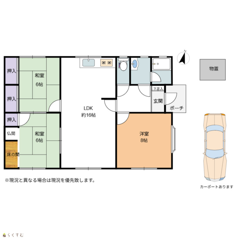 3LDK (和室:6.0畳、6.0畳) (洋室:8.0) LDK16.0 |