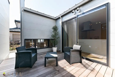 | 備考 | 憧れの中庭のある生活をご提案するモデルハウスがついに誕生。 中庭は4.5坪(9帖)の広々としたウッドデッキ を採用し、キッチン・リビング・玄関・寝室から見えるように家の中心に設計しました。 家の中心に中庭を設けることにより、プライベートスペースのプライバシーの確保、中庭からの光による部屋の明るさなどさまざまな利点があります。 他にも「木」「塗り壁」「ガルバリウム鋼板」「窯業系」を組み合わせた圧巻の外観。 内装は「グレー」「白」「木」を中心にデザインされており、シンプルでありながら上質な空間を演出しております。 |
