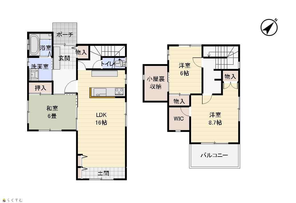 3LDK (和室:6.0畳) (洋室:8.7、6.0) LDK16 小屋裏収納、外物置付き |