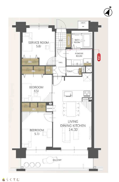 2LDK (洋室:5.7、4.6) LDK14.3 5.8帖のサービスルーム有 |