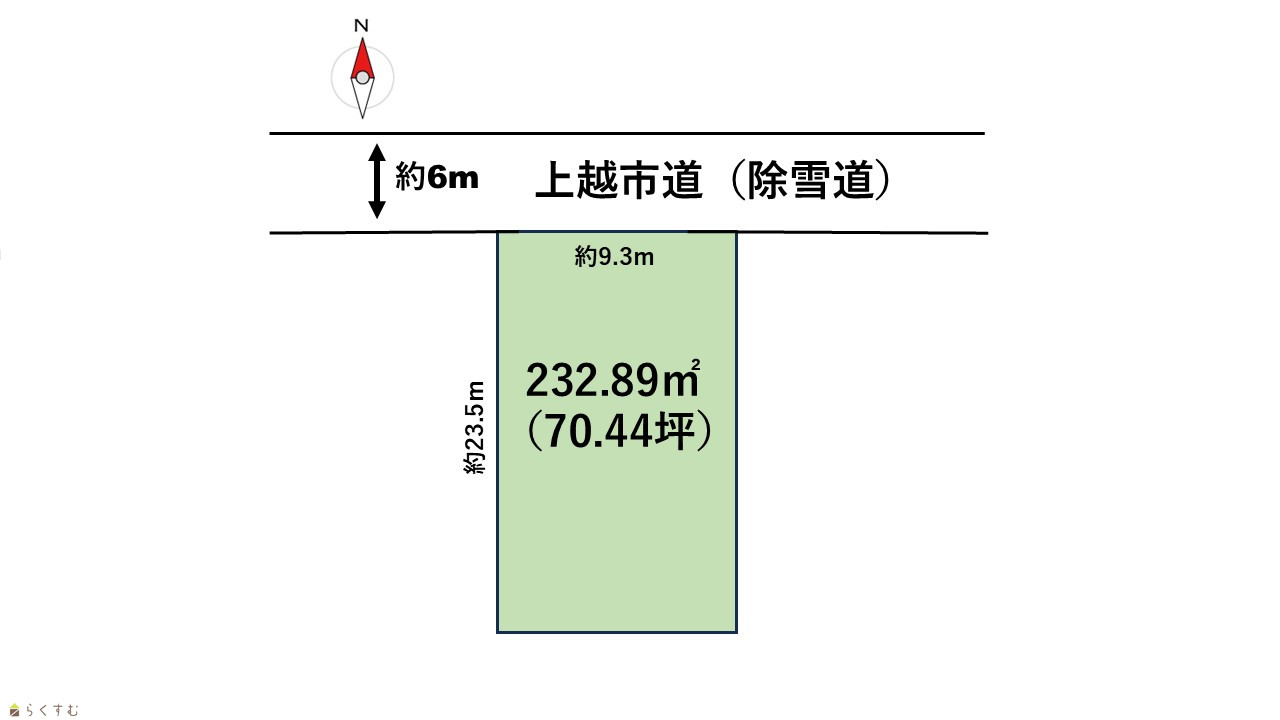 | 形状 | 間口 9.3m × 奥行 23.5m | 道路 | 公道 北側6m |