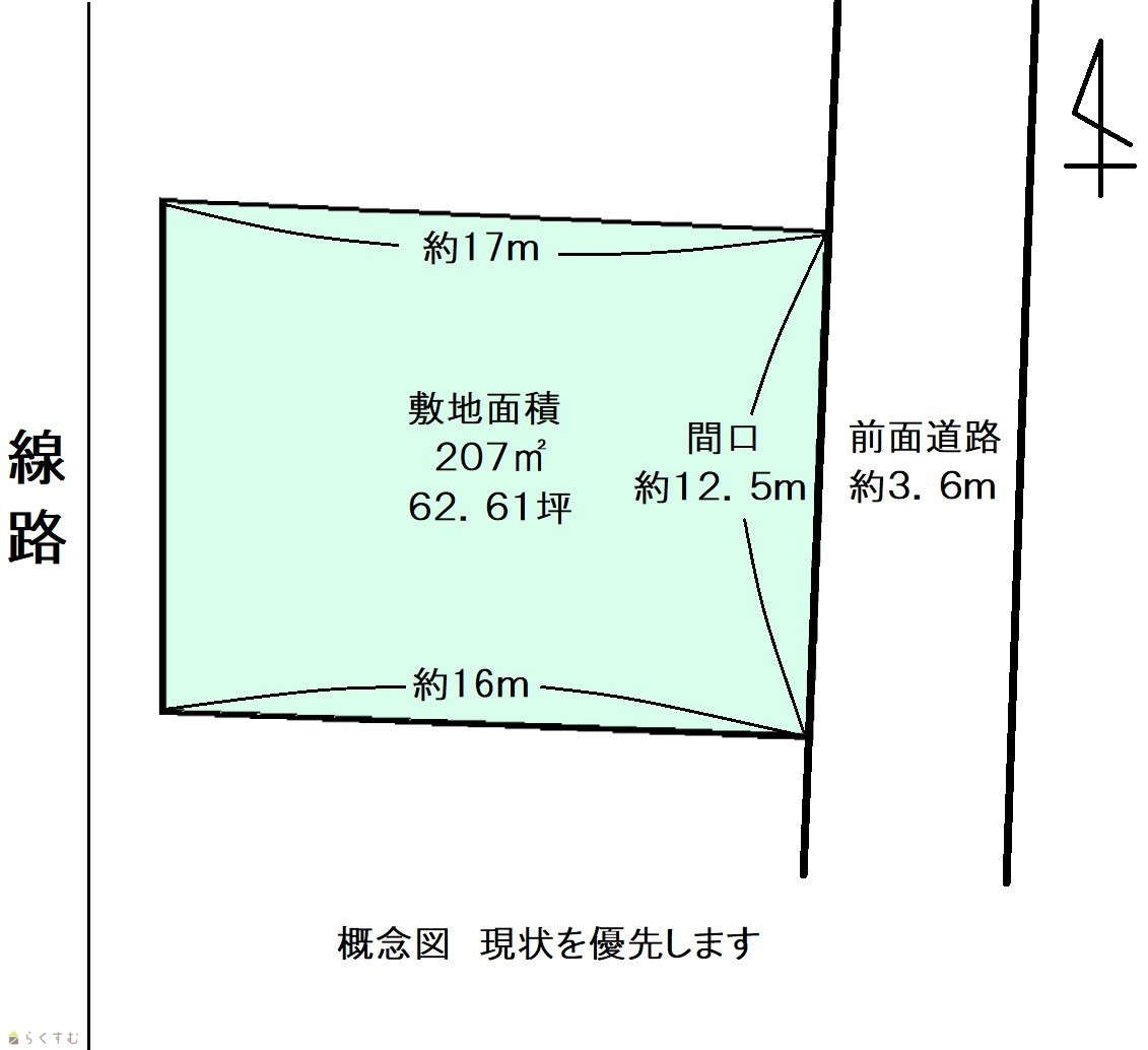 | 形状 | 間口 12.5m × 奥行 16m | 道路 | 東側3.6m・北側2.6m |