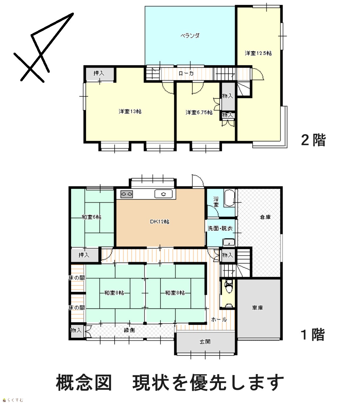 | 間取り | 6DK (和室:8畳、8畳、6畳) (洋室:12.5、6.75、13) | ||