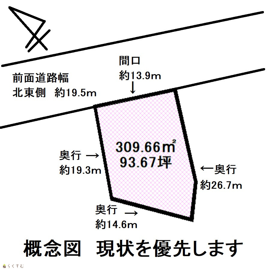 | 形状 | 間口 13.9m × 奥行 19.3m | 道路 | 北東約19.5m |