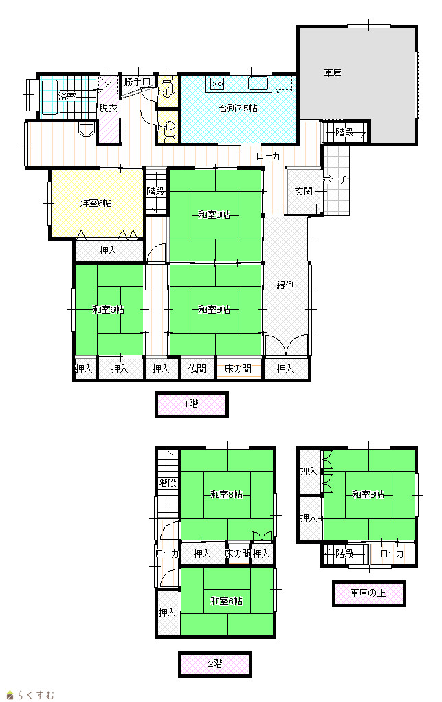 7DK (和室:8畳、8畳、8畳、8畳、6畳、6畳) (洋室:6) DK7.5 |