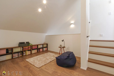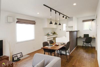 | 北から南へ、キッチン・ダイニング・リビングを一直線に配置し、その先には2.5m幅の掃き出し窓。屋根付きテラスが夏の日差しを遮り、適度な光と温もりが差し込む心地よいLDKです。自然と家族が集まる空間を目指して設計された住まい。2階に上がり、4段降りた先には5.5帖のフリースペースを設け、家族のセカンドリビングとして多彩に活用できます。カップボード・カーテン・エアコン3台付きで快適。4帖の小屋裏収納つき。ガレージにはタイヤやアウトドア用品などもたっぷり収納できます。 | |||