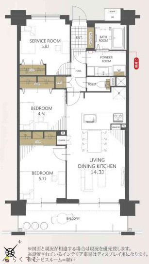 2LDK (洋室:5.7、4.5) LDK14.3 5.8帖納戸付き |