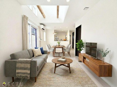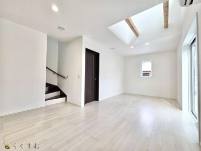 令和8年2月築。吹き抜けのあるリビングで開放感のある空間が広がります。 自然光が差し込み、明るい室内環境に配慮されています。 キッチンから洗面脱衣室へとつながる動線で家事がしやすい間取りです。 移動がスムーズで日々の負担軽減につながります。