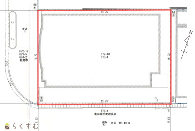 | 形状 | 間口 16.72m × 奥行 23.74m | 道路 | 西側 市道 幅員約30m 南側 市道 幅員約5.8m |