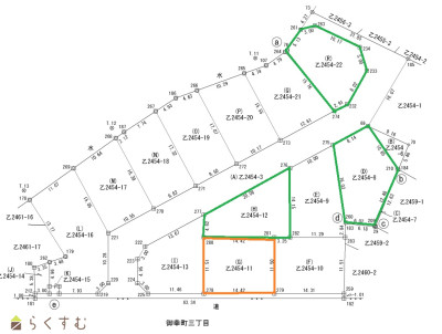 | 設備 | 角地、整形地、前道6m以上、更地、スーパー近く、閑静な住宅街、建築条件なし、所有権、即引き渡し可、側溝、都市ガス(前面道路)、電気、都市ガス(宅地内)、上水道(宅地内)、下水道(宅地内)、住宅向け | ||