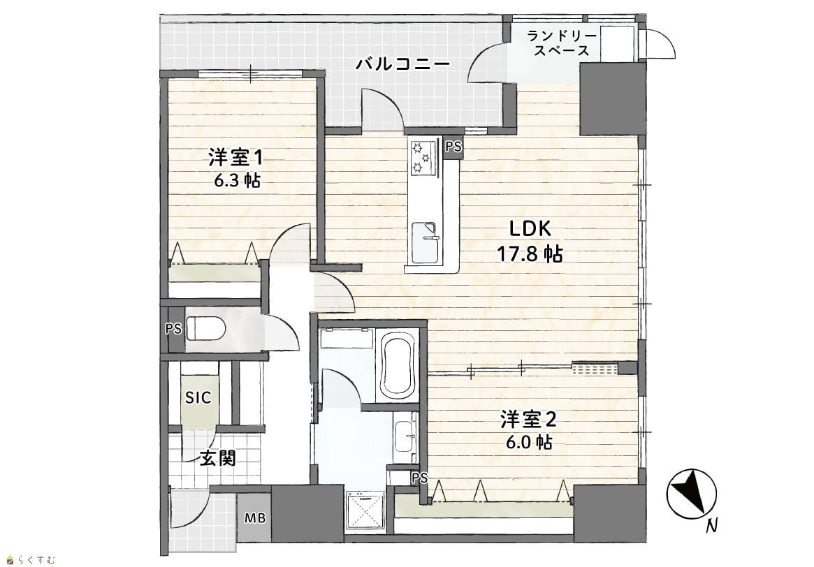 2LDK (洋室:6.3、6) LDK17.8 |