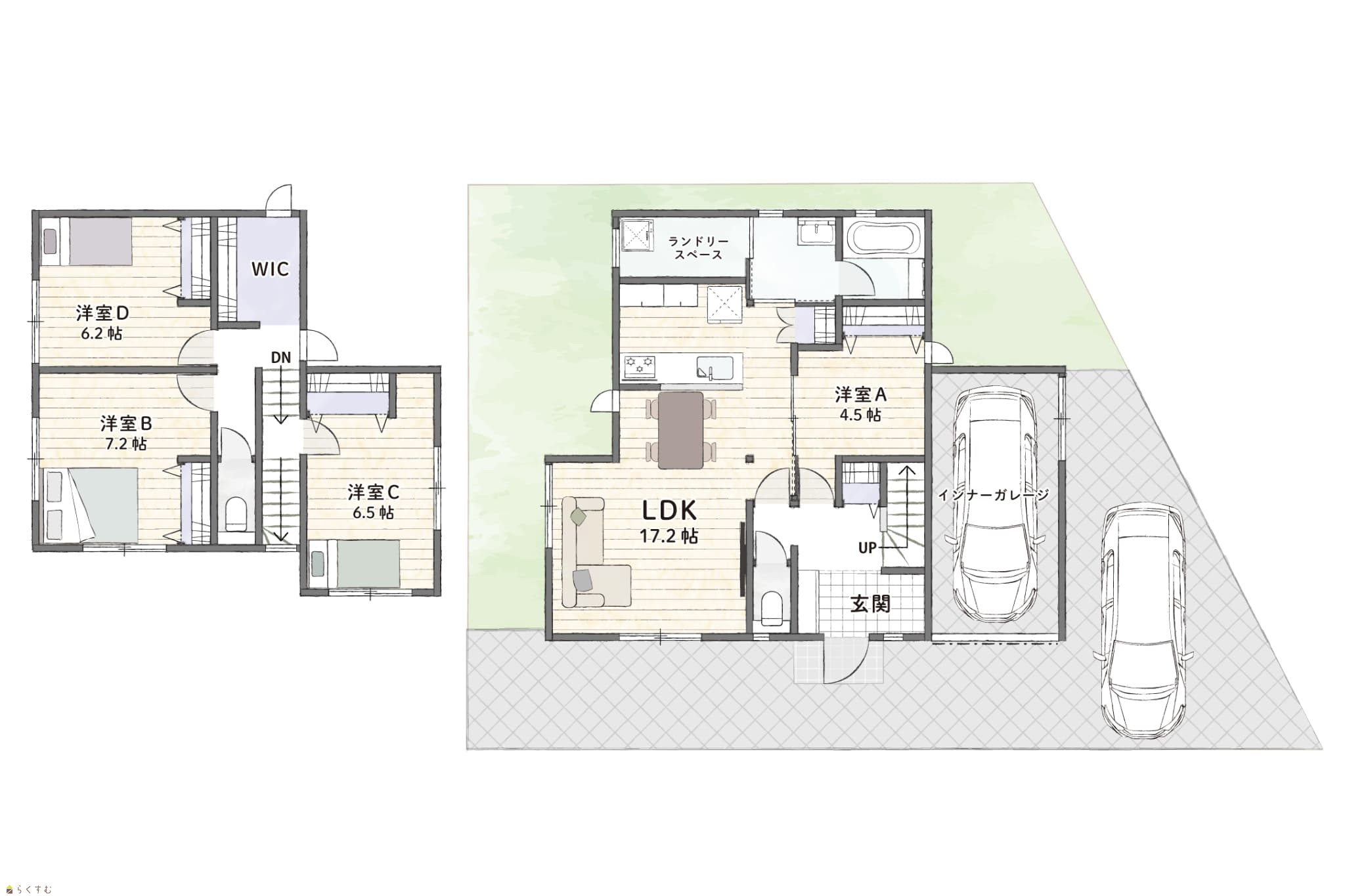 4LDK (洋室:4.5、7.2、6.5、6.2) LDK17.2 ランドリースペース、インナーガレージ(1台分)有 |