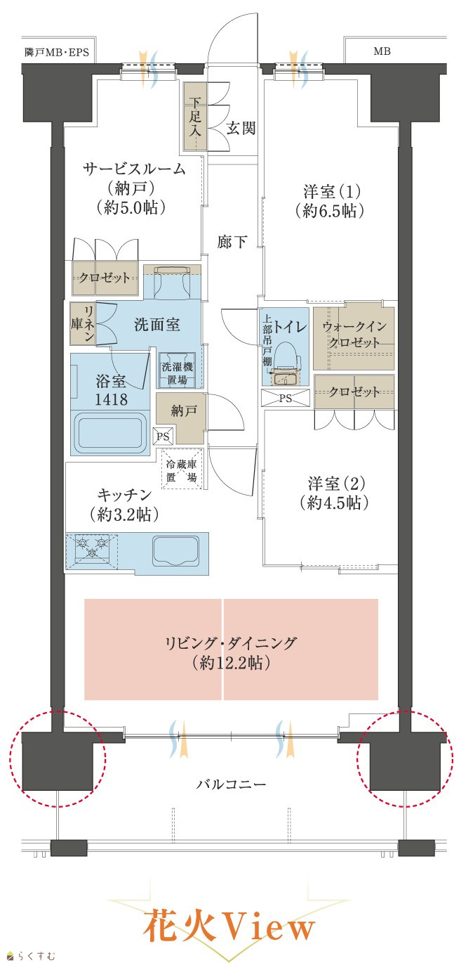 2LDK (洋室:6.5、4.5) LD約12.2帖、K約3.2帖、サービスルーム(納戸)約5.0帖 |