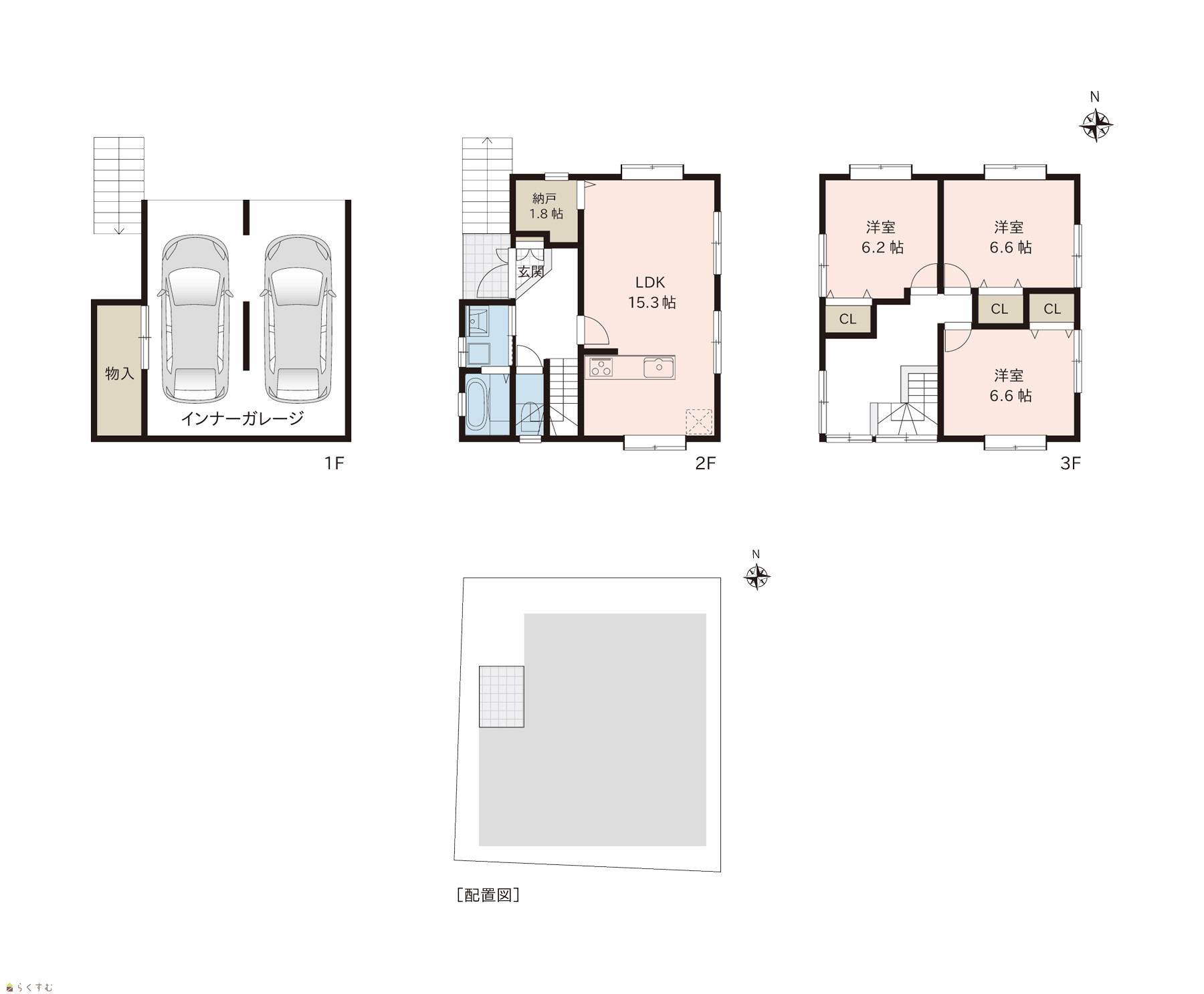 3LDK (洋室:6.6、6.6、6.2) LDK15.3 |
