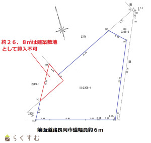 市街化調整区域のため建築の際は都市計画法第43条の許可が必要となります。一部宅地ですが建築敷地に含められない土地(約26.8㎡)があります。上水道の引込工事が必要となります。