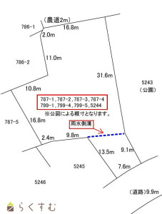 土地確定測量は売主負担で行います。(令和8年春頃予定)/敷地内に雨水側溝が存在します。/農地法届出は弊社にて無料で行います。/下水受益者負担金が敷地の一部で賦課されます。(約17万円)