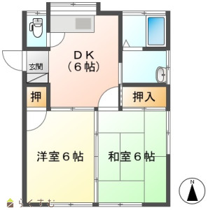 2DK (和室:6畳) (洋室:6)、DK6、B・T別室/水洗トイレ/洗面台/洗濯機置場/給湯/シャワー/エアコン