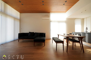 カーテン越しにハイサイドサッシから差し込む明るい空間