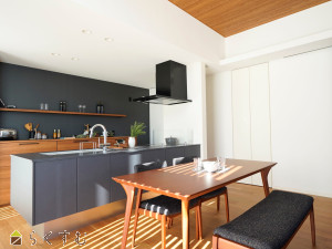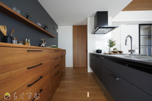 木目が美しい大型カップボードも標準搭載で収納も充実