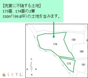 【売買に不随する土地】173番、174番の2筆330㎡(99.8坪)の土地を含みます。