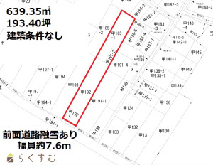• 設備 前道6m以上、学校近く、建築条件なし、所有権、都市ガス(前面道路)、上水道(前面道路)、下水道(前面道路)、都市ガス(宅地内)、上水道(宅地内)、下水道(宅地内)、前面道路融雪設備あり