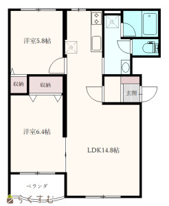 2LDK (洋室:6.4、5.8)、LDK14.8