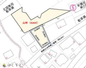 ・売買物件は、宅地(356.66㎡・101.53坪)の他、山林(414㎡・125.23坪)も含まれます。