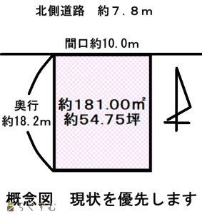 整形地、前道6m以上、閑静な住宅街、建築条件なし、所有権、側溝、都市ガス(前面道路)、上水道(前面道路)、電気、下水道(宅地内)、住宅向け